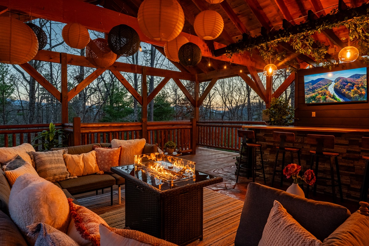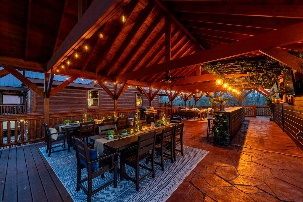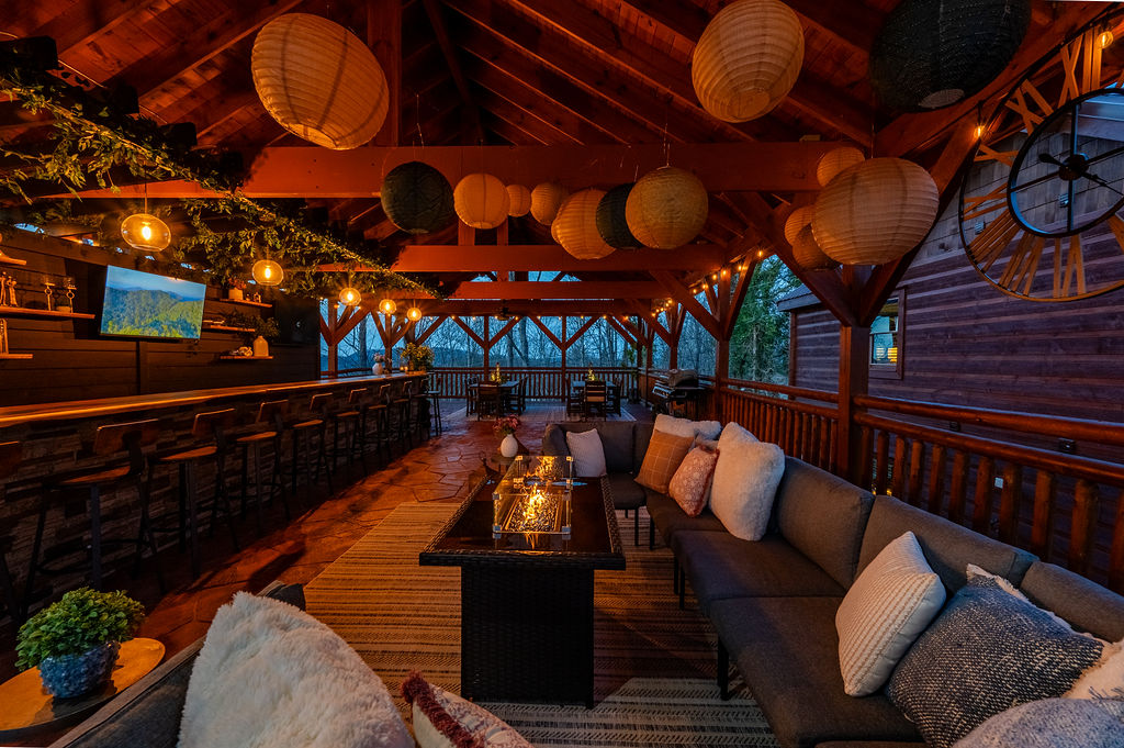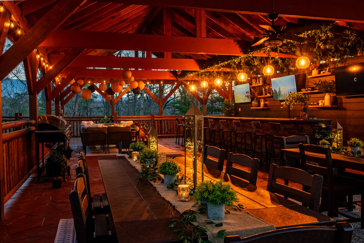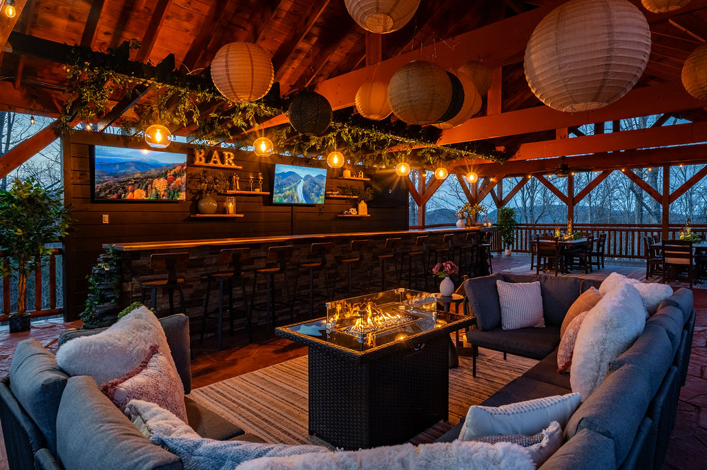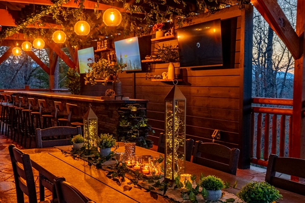 Relax and recharge at HEAVEN IN THE HILLTOPS, a breathtaking mountain escape nestled in the picturesque Smoky Mountains. This luxurious 8 bedroom retreat, sleeping up to 35, is the perfect getaway for large groups of family and friends to gather while being close to all the local attractions. A PRIVATE HEATED INDOOR POOL as well as an outdoor hot tub combine with a family room full of arcade games, pool table, and ping pong to offer endless entertainment. A newly installed, custom OUTDOOR PLAY STRUCTURE directly off the back deck of the cabin is loaded with swings, slides, a climbing wall, and outdoor games. For all the kids (and kids at heart), a TWO STORY COVERED SLIDE connects the back deck to the play structure, but there are also stairs to reach it for the fainter of heart. But the true highlight of this cabin is the BRAND NEW 25 FOOT CUSTOM LIVE EDGE SPORTS BAR with seating for 12 constructed on the outdoor covered patio. THREE FLAT SCREEN TV’s are mounted on the wall behind the bar, giving it a full sports bar experience, and a waterfall cascades out of either side of the live edge wood bar top. Combine this with an outdoor lounging area for 10, a new PROPANE FIRE TABLE, and a dining area for 20, you may never want to leave the patio!