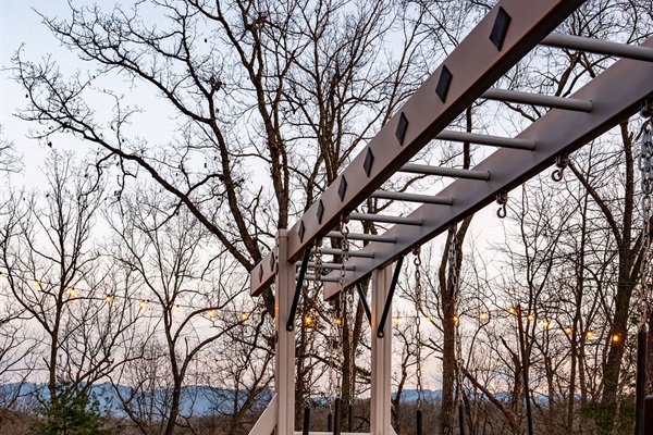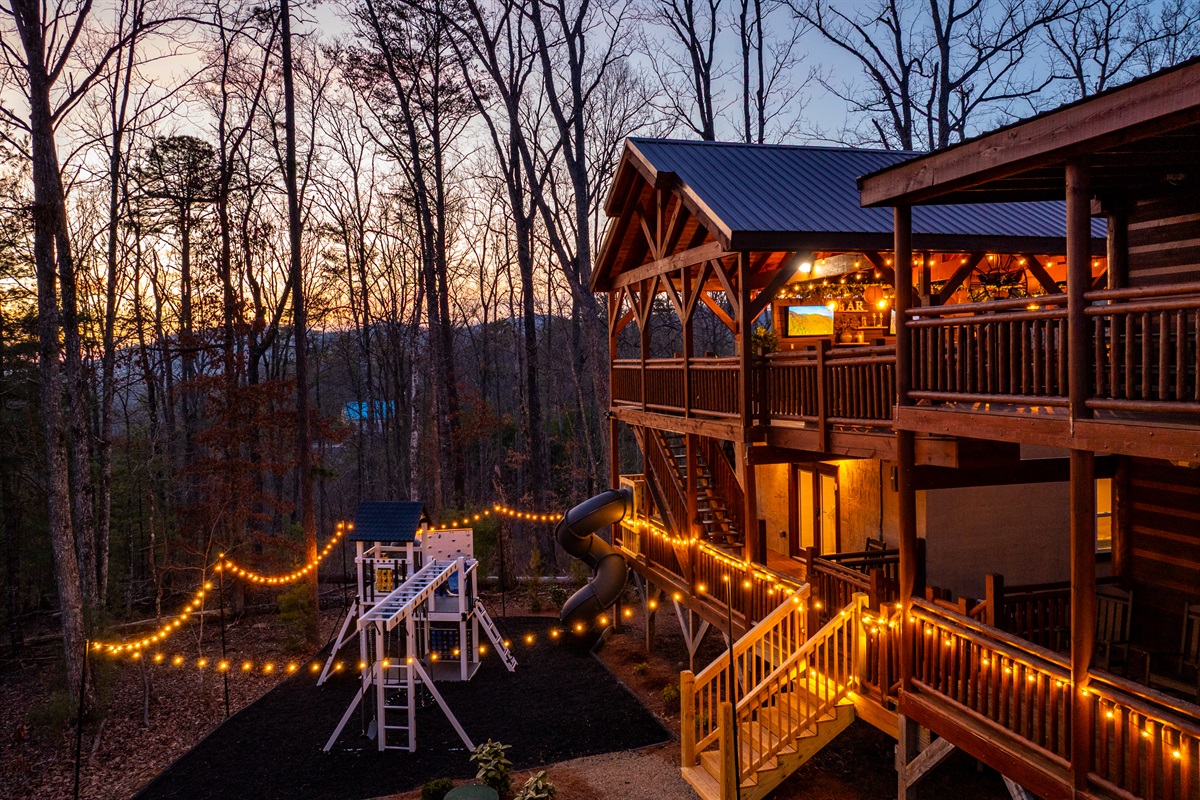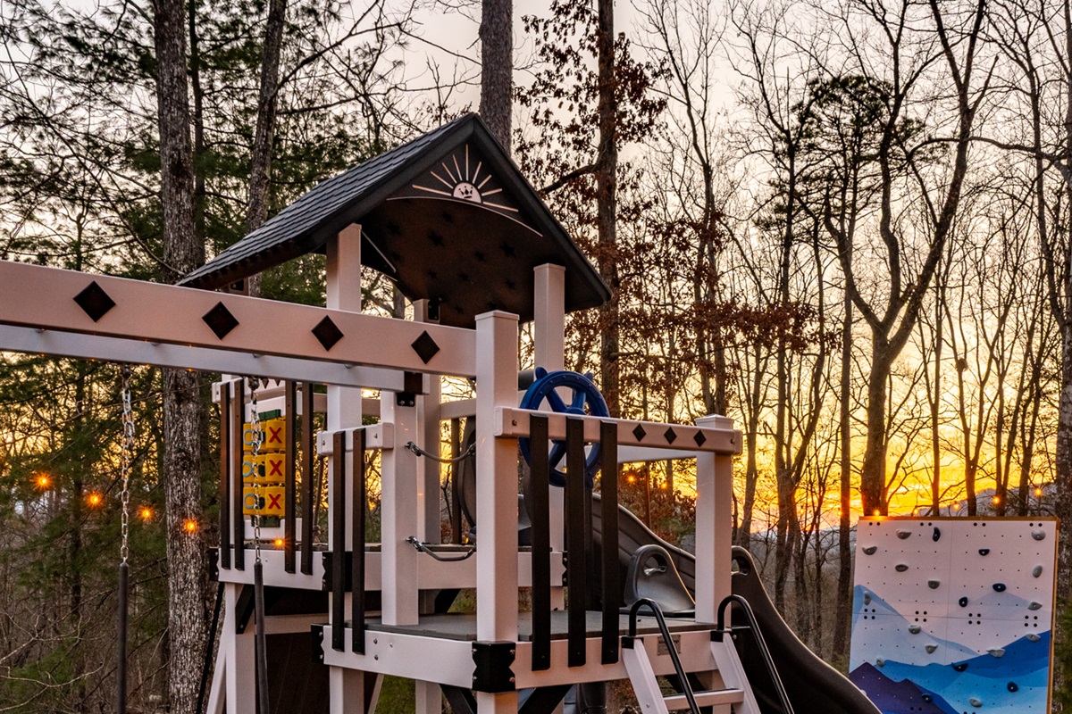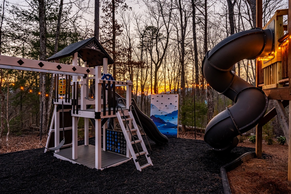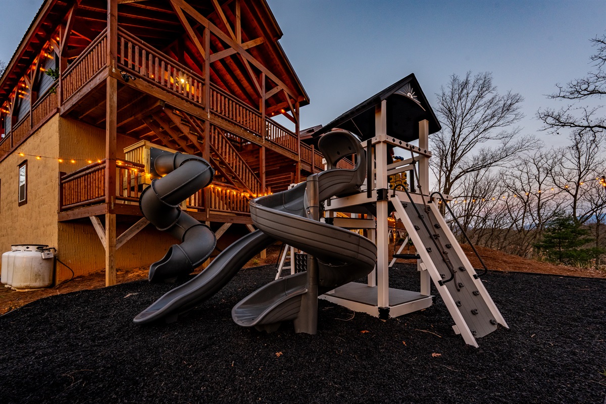 Directly behind the indoor pool/outdoor covered patio is a BRAND NEW CUSTOM outdoor play structure for entertaining all the littler travelers. There are three types of SWINGS, SLIDES, AND A CUSTOM CLIMBING WALL as well as a covered lookout tower. Outdoor games such as an oversized Connect Four, a lookout telescope, and driving wheel complete the fun. A COVERED TWO STORY SLIDE connects the deck to the play structure for endless fun for both kids and kids at heart. For those slightly more faint of heart, the play area can be accessed by steps from the lower deck straight from the indoor pool area.